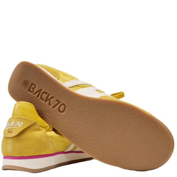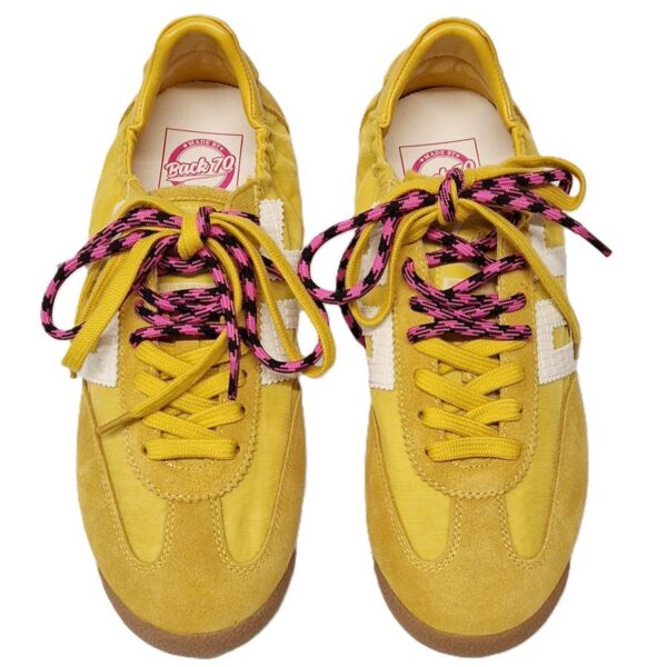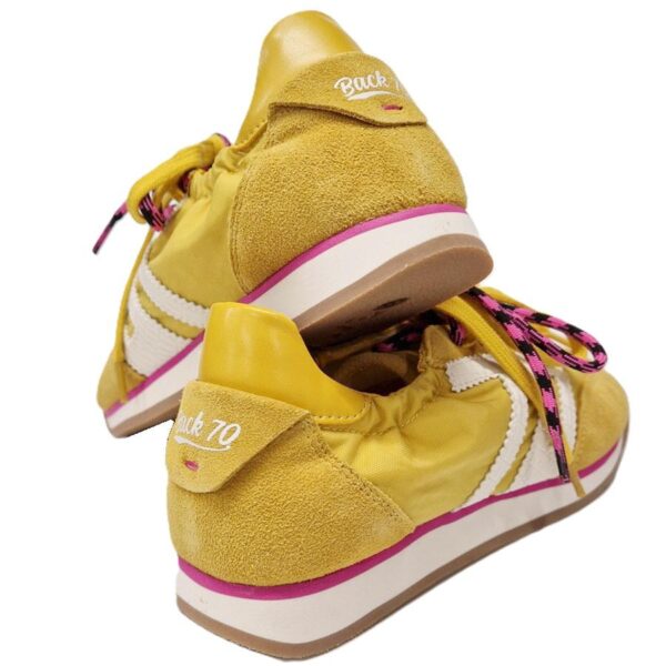 BACK70 sneaker, geel stof/suede. veter roze en geel