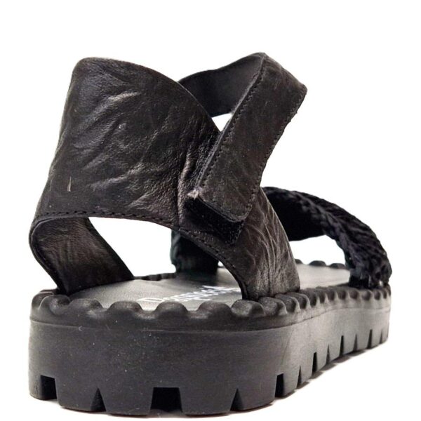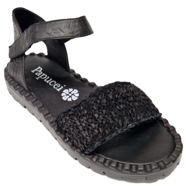PAPUCEI sandaal, zwart leer/vlecht. evt. tas in het zelfde materiaal verkrijgbaar.